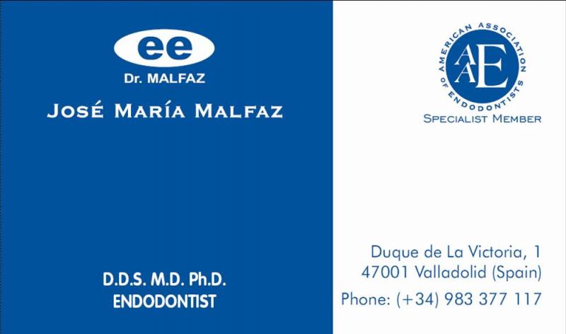 Dr. Jose-Maria Malfaz received his dental degrees from the Dental School University of Granada, Spain. He completed his specialty certificate in Endodontics at University of Southern California, USA, under Dr. James H. Simon. Also he graduated in Medicine and Surgery from the University of La Laguna, Tenerife (Spain), and earned a PhD degree in Medicine and Surgery from the University of Granada (Spain). He is Specialist Active Member of the American Association of Endodontists, Active Member of the Spanish Association of Endodontists (AEDE) and Member of the European Society of Endodontics (ESE). He is President of the Spanish Association of Endodontists (AEDE) and was President of the XXIX Annual Meeting of the Spanish Association of Endodontists (AEDE). He was awarded the American Association of Endodontists Resident Award in 2006. He has published clinical and scientific articles, and contributed to 3 chapter books in Endodontics. Dr. Malfaz teaches at different post-graduate (Spain, Italy and USA) and Continuum Education programs of Endodontics, and he has presented lectures and seminars in Endodontics at Universities and Dental meetings throughout Spain as well as Argentina, Costa-Rica, Ecuador, Venezuela, Paraguay, Peru, USA, Austria and Italy. He maintains a private practice limited to Endodontics and Endodontic Microsurgery since 1994 in Valladolid, Spain.
